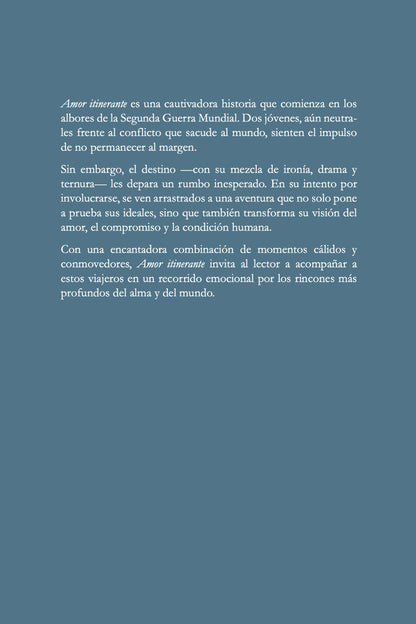 Amor itinerante es una cautivadora historia que comienza en los albores de la Segunda Guerra Mundial. Dos jóvenes, aún neutrales frente al conflicto que sacude al mundo, sienten el impulso de no permanecer al margen.